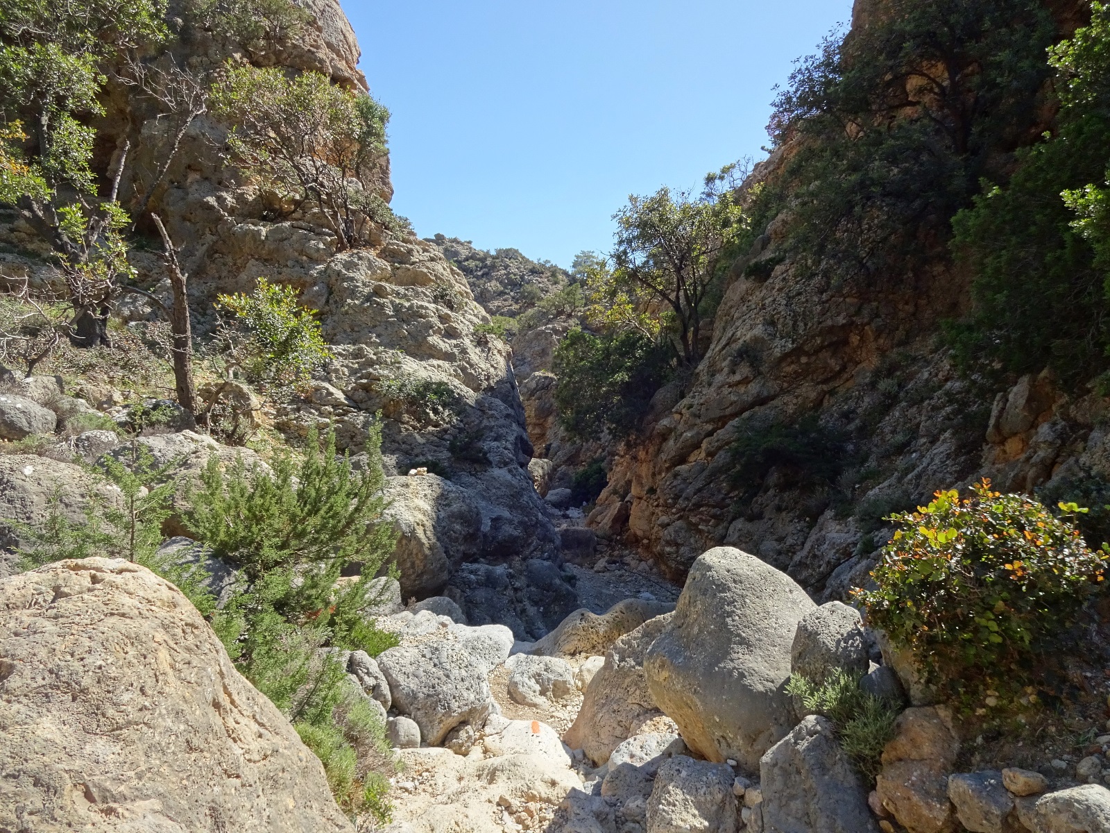 Heute bin ich vom Anidri Strand durch die gleichnamige Schlucht zum kleinen Bergdorf Anidri gewandert. An und für sich eine relativ einfache und kurze Wanderung. Ich habe allerdings den Abzweig nach Anidri übersehen und bin noch lange Zeit im trockenen Bachbett durch teilweise unwegsames Gelände gewandert, bis ein Weiterkommen irgendwann nicht mehr möglich war und