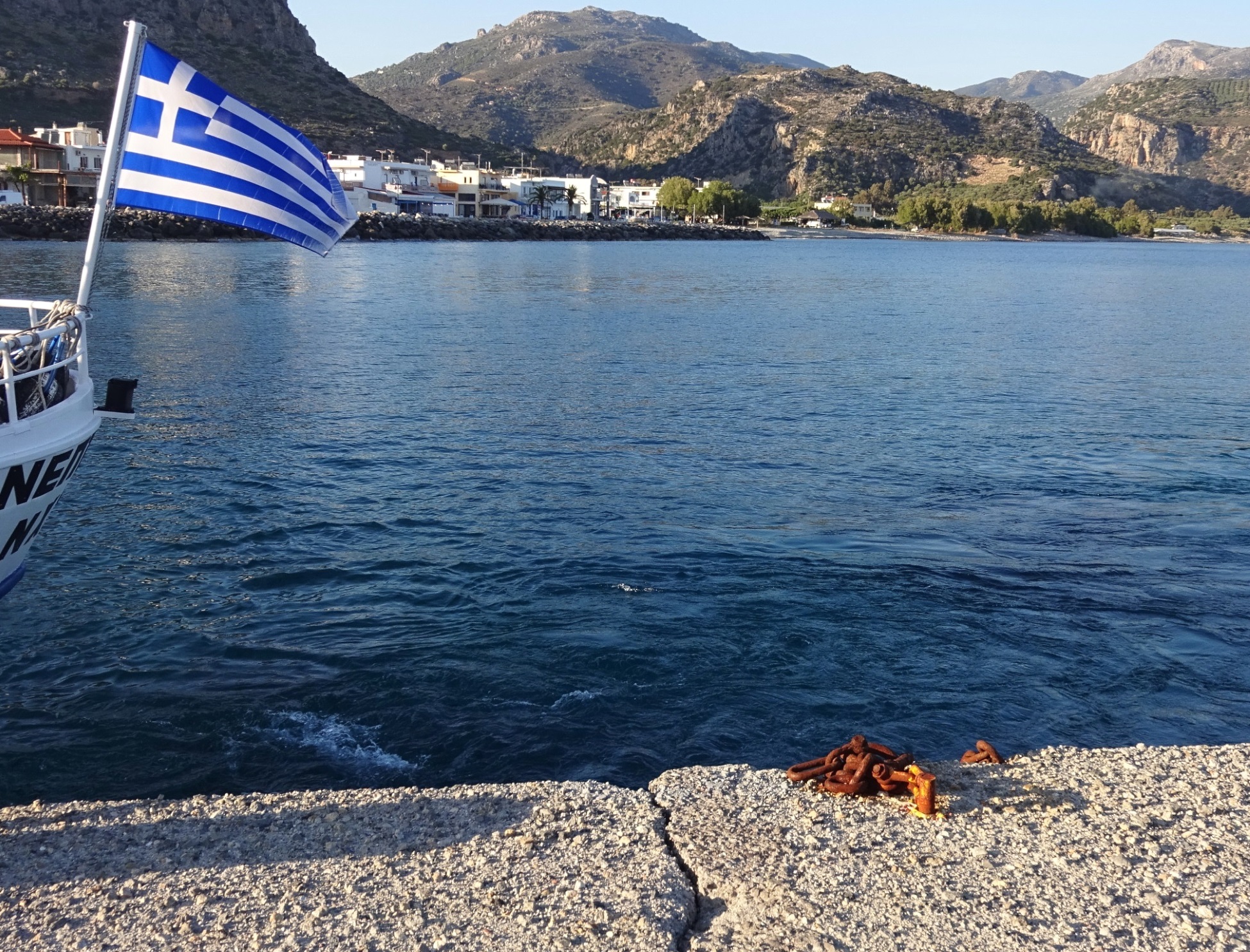 Gestern habe ich eine wunderschöne, lange Wanderung gemacht. Ich bin mit der kleinen Fähre „Neptune“ um 8:30 nach Sougia gefahren, um am E4 über Lissos nach Paleochora zurückzuwandern. Die knapp einstündige Fahrt über das glatte Meer nach Sougia war ein Genuss. Ich liebe Bootfahren 🙂 Der Wanderweg begann oberhalb des kleinen Hafens, vom dem auch