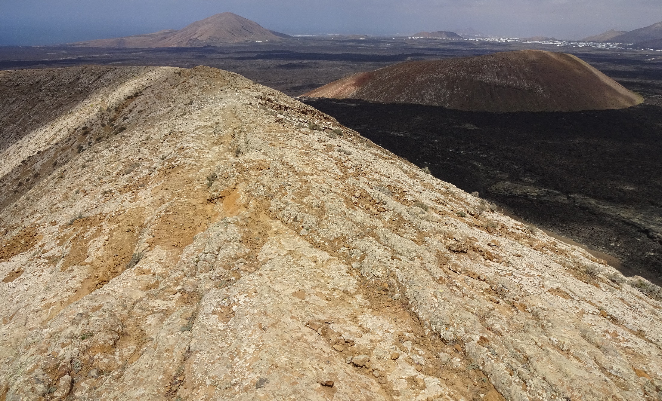 Den heutigen Vormittag habe ich gemütlich in Playa Blanca und am westlichen Dorfstrand Playa Flamingo verbracht. Fuerteventura und Los Lobos waren wieder nur schemenhaft mit ausreichend Vorstellungsvermögen erkennbar. Nachmittags bin ich auf den „Hausvulkan“ Montaña Roja gegangen. Die Wanderung ist einfach und nach kurzer Zeit war ich oben am großen, begehbaren Krater, den ich umrundete.