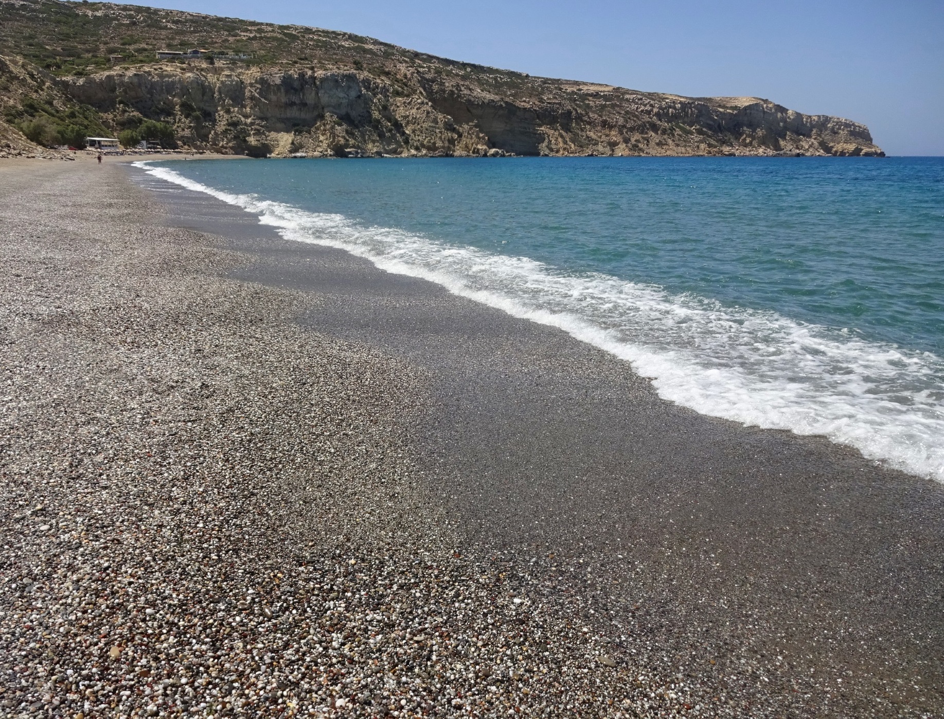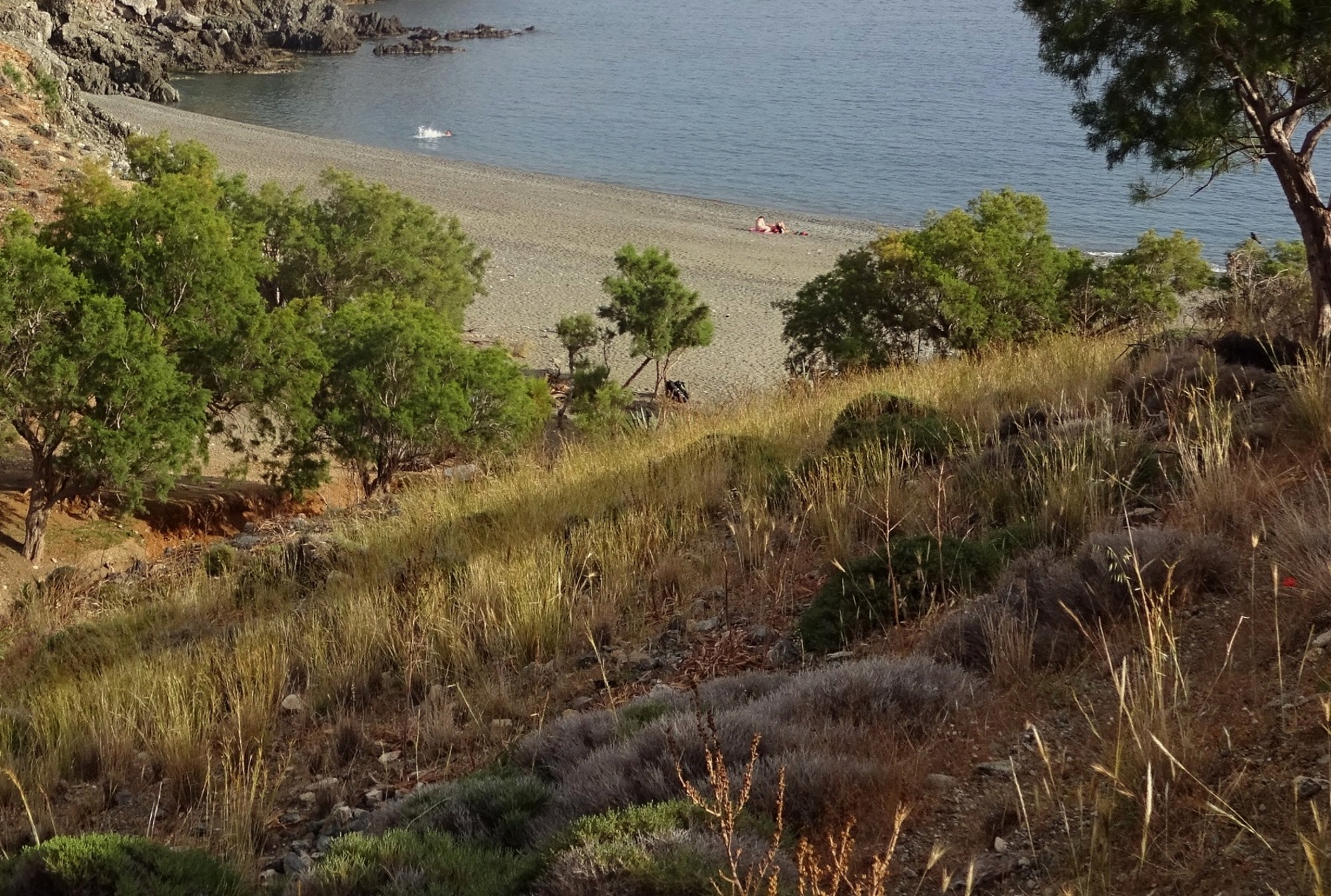 Wieder ein schwülheißer Hochsommertag Mitte Mai! Ich hab die angenehmen Morgenstunden am Strand von Matala genossen. Dann bin ich zum Red Beach gewandert. Dieser Strand, der in einer knappen halben Stunde erreichbar ist, heißt so, weil der Sand in der Abendsonne rötlich leuchtet. Zwischendurchblick zurück nach Matala: Abseits des Weges gibt es mehrere große, teilweise