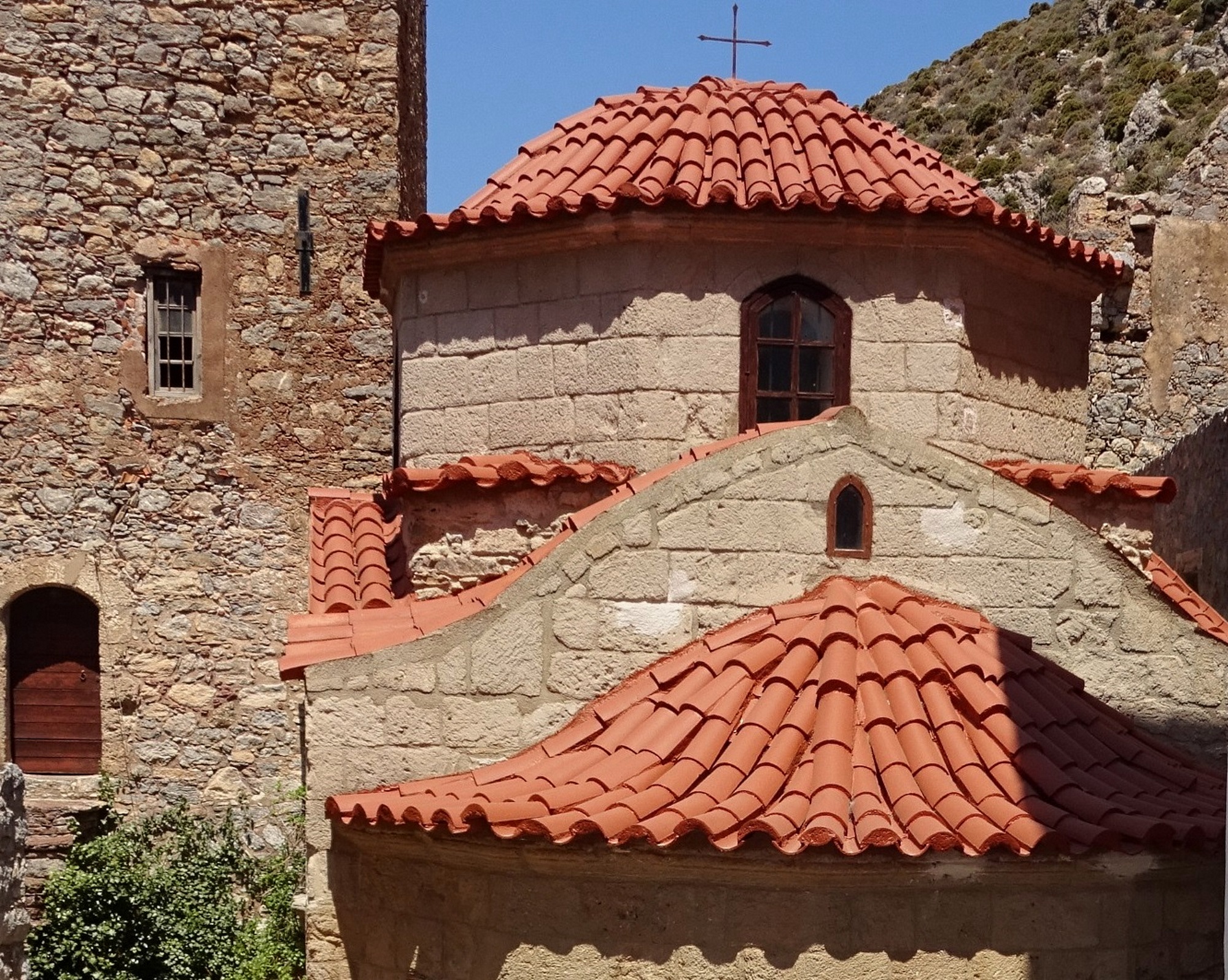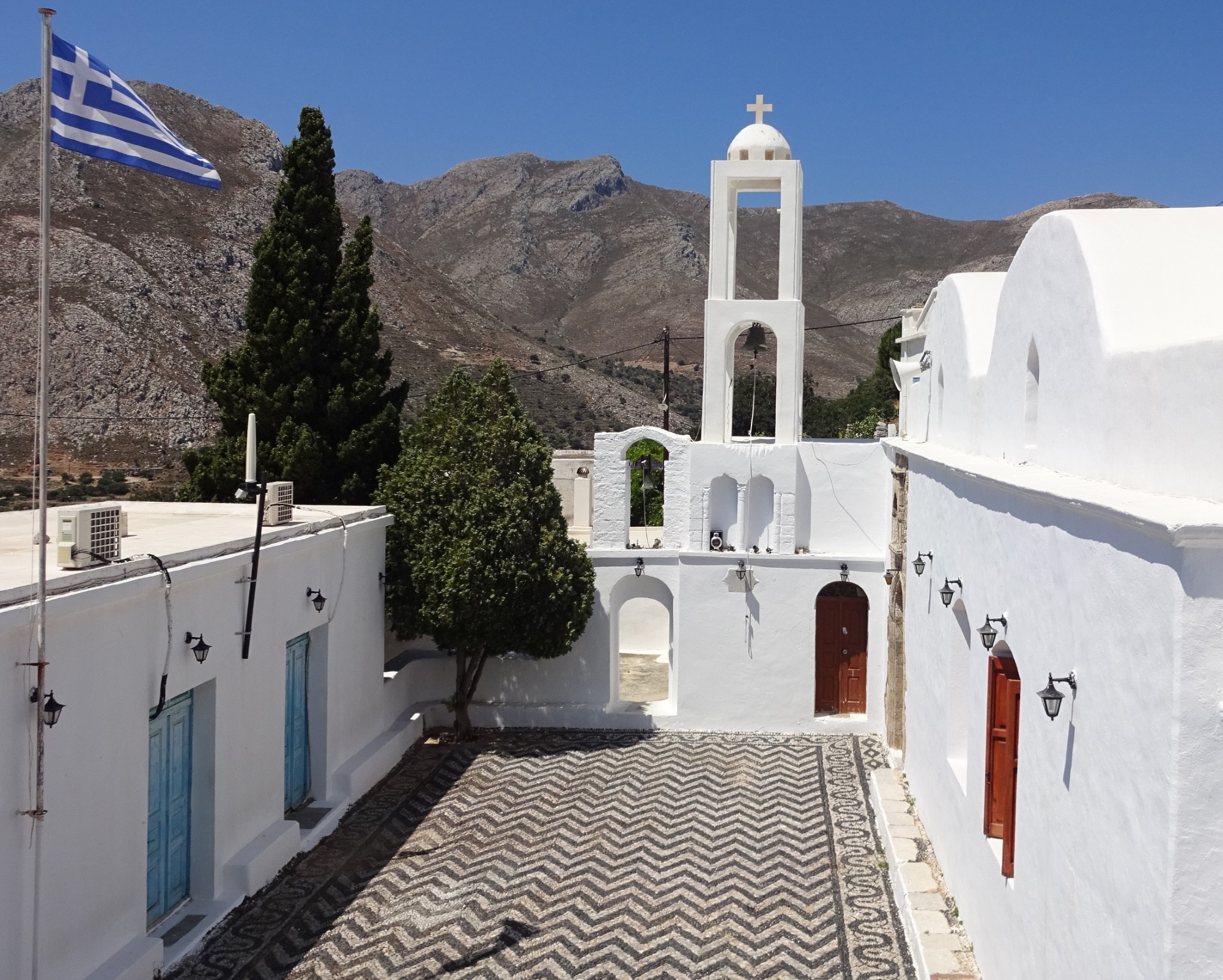 Heute habe ich das Kloster Agios Panteleimon besucht, das sich hoch über dem Meer im Nordwesten der Insel befindet. Jeden Sonntag fährt der Inselbus die kurvenreiche Bergstrecke zum Kloster. Warten auf den Bus… Zum Glück gibt es beim Dorfplatz Schattenbäume und verspielte Kuschelkatzen 🙂 Der Bus kam nicht. Gestern bin ich damit noch nach Eristos