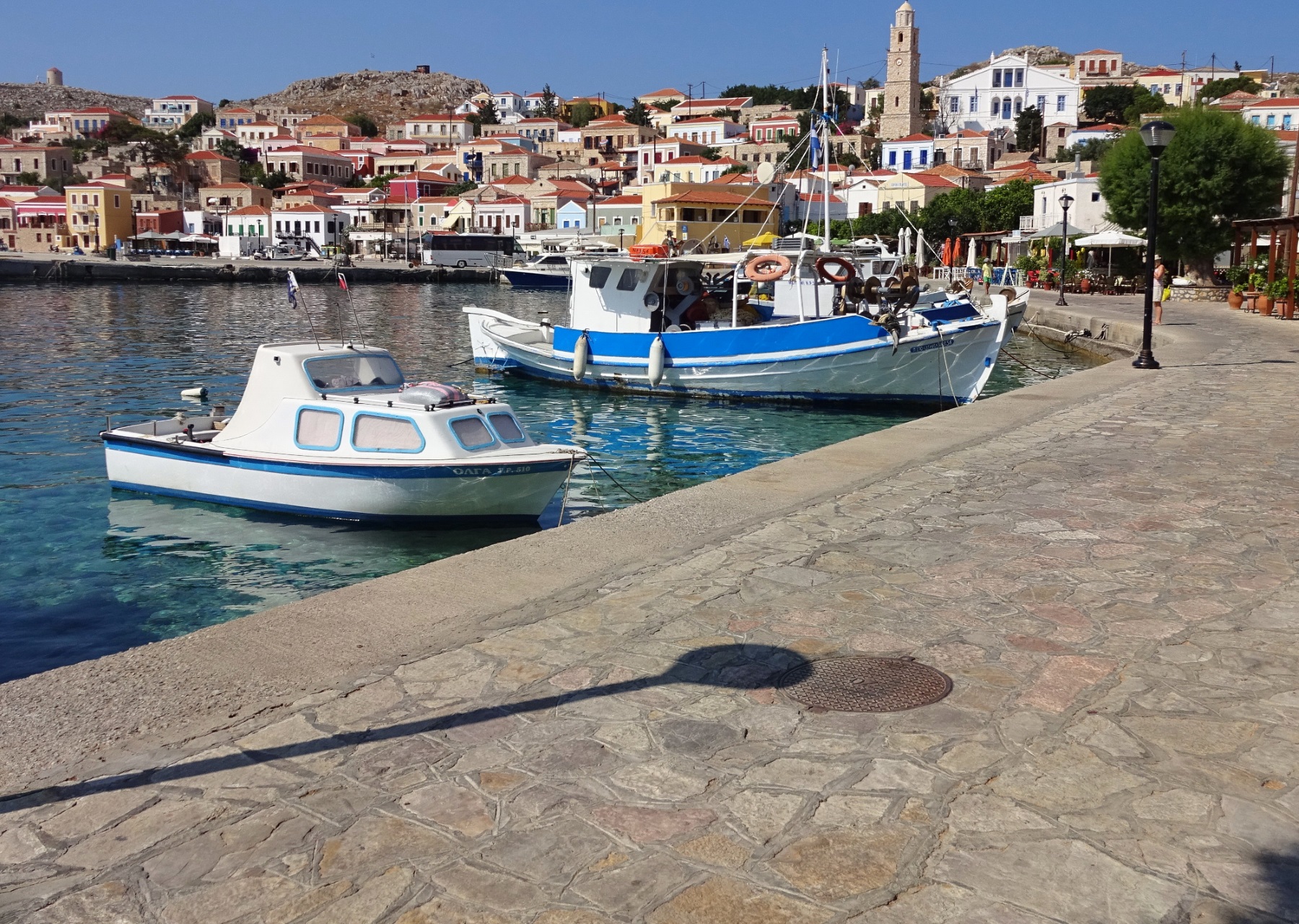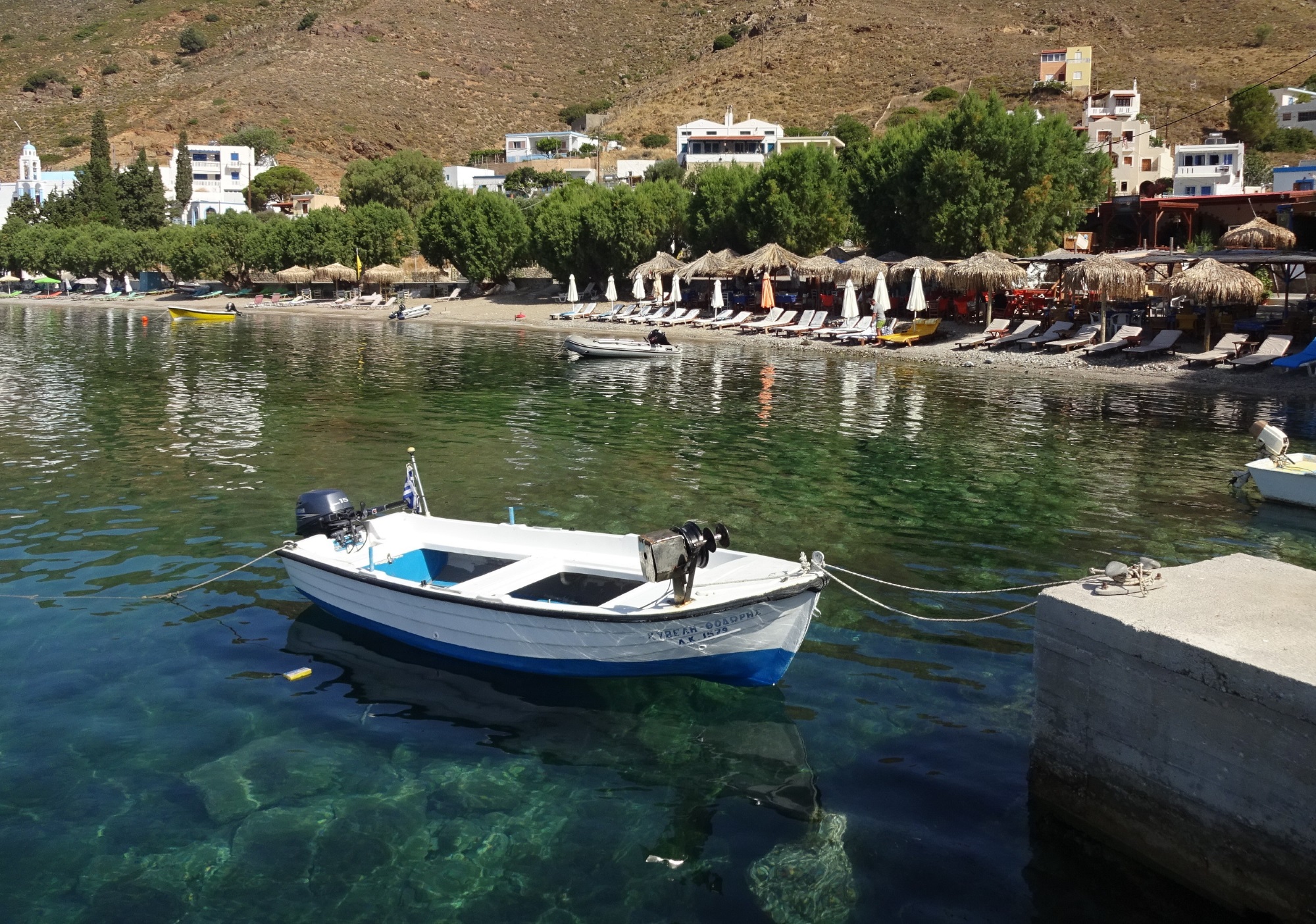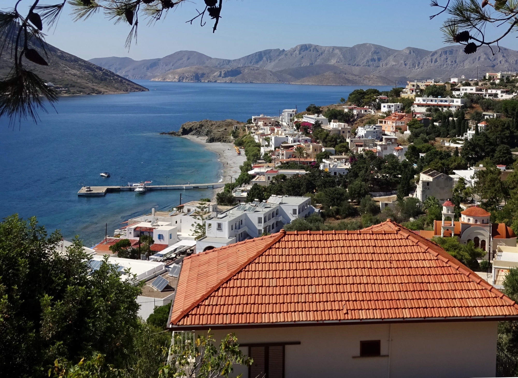 Heute bin ich von Mirties mit dem Boot zur kleinen Insel Telendos gefahren. Die Überfahrt dauert nur ein paar Minuten. Bis 554 n. Chr. war Telendos ein Teil von Kalymnos. Ein gewaltiges Erdbeben führte damals zur Abtrennung. Blick zurück nach Mirties: Und schon fast da: Das autofreie Inselchen Telendos besteht aus einem kleinen Dorf