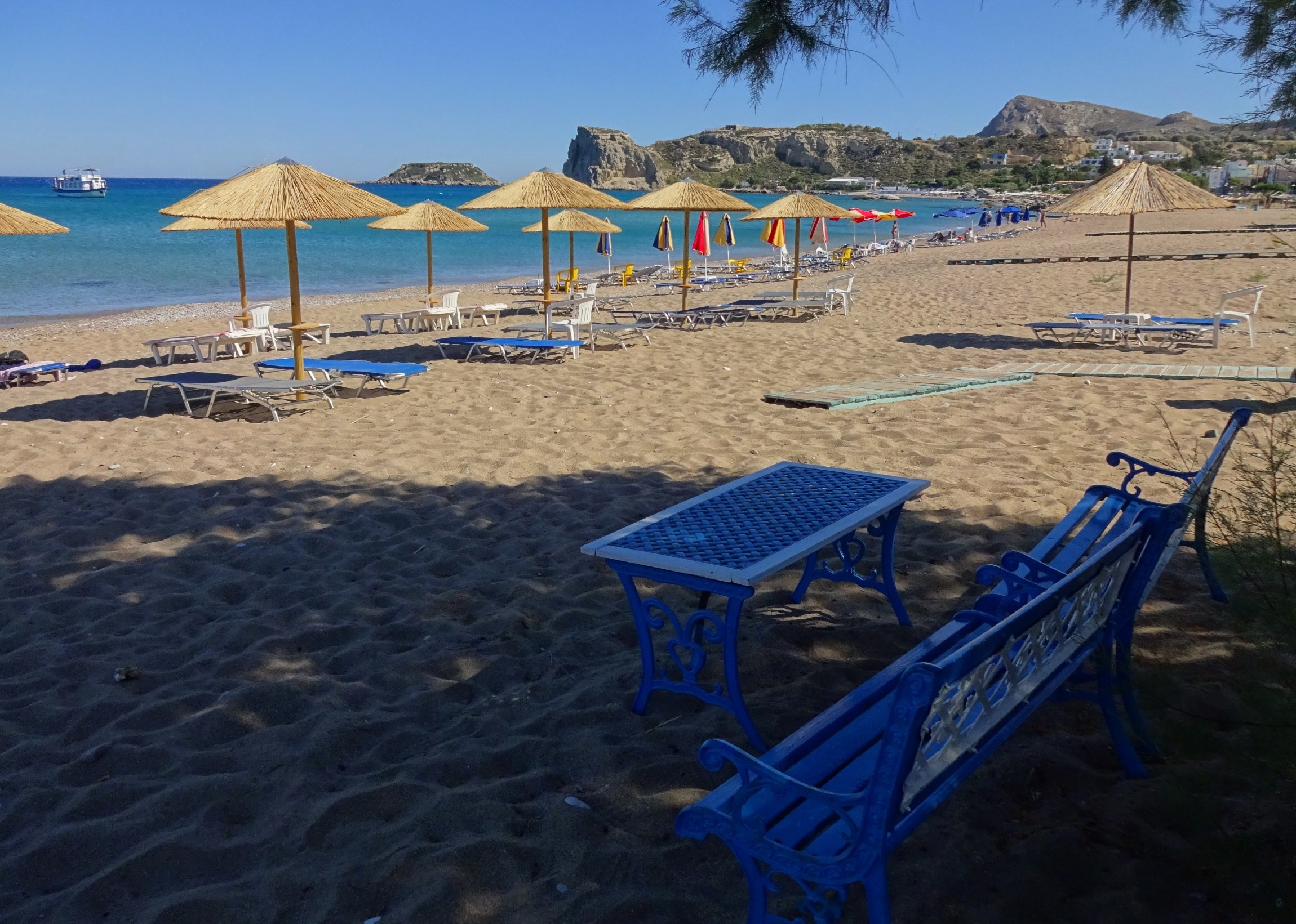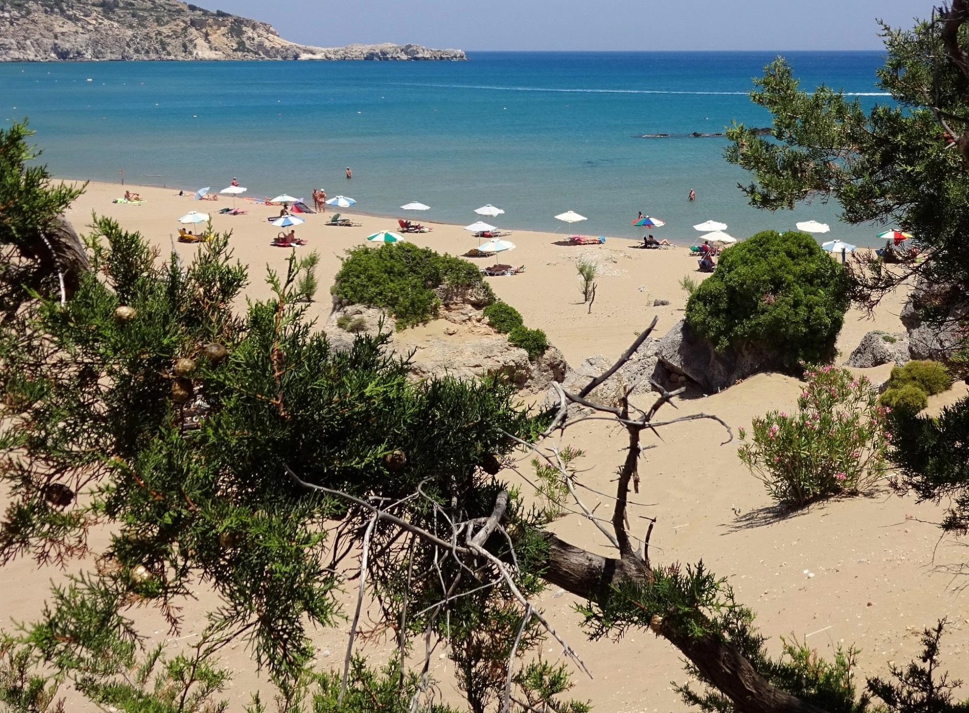 Nach dem regnerischen gestrigen Tag war heute wieder wolkenloses Sommerwetter, das ich zum Schwimmen nutzen wollte. Ich habe für die nächsten Tage bis zur Abreise nach Chalki ein kleines Auto gemietet und bin heute damit zum Tsampika Strand gefahren. Schönes, klares Wasser, feiner Sandstrand. Obwohl kein Dorf in der Nähe ist, waren für Anfang Juni