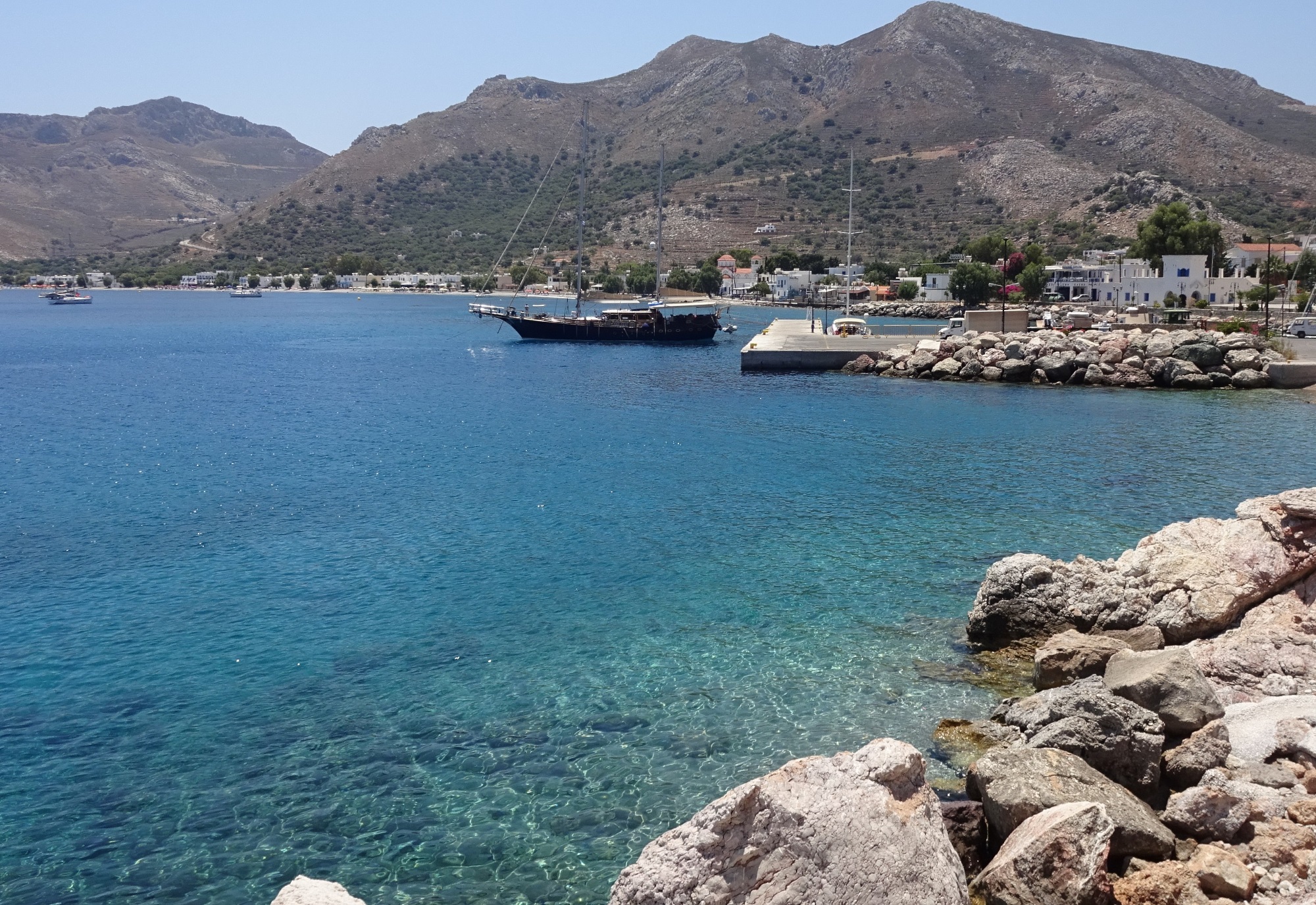 Ich bin heute mit dem Bus nach Emporios im Nordwesten von Kalymnos gefahren. Emporios ist ein kleines Dorf mit Tavernen, einigen Zimmervermietern und einem schmalen Strand mit kostenlosen Strandliegen und Hängematten. Im Meer ist leider viel Seetang und zwischen den Steinen gibt es Seeigel. Zum Baden hat es mir dort nicht gefallen, aber die Atmosphäre