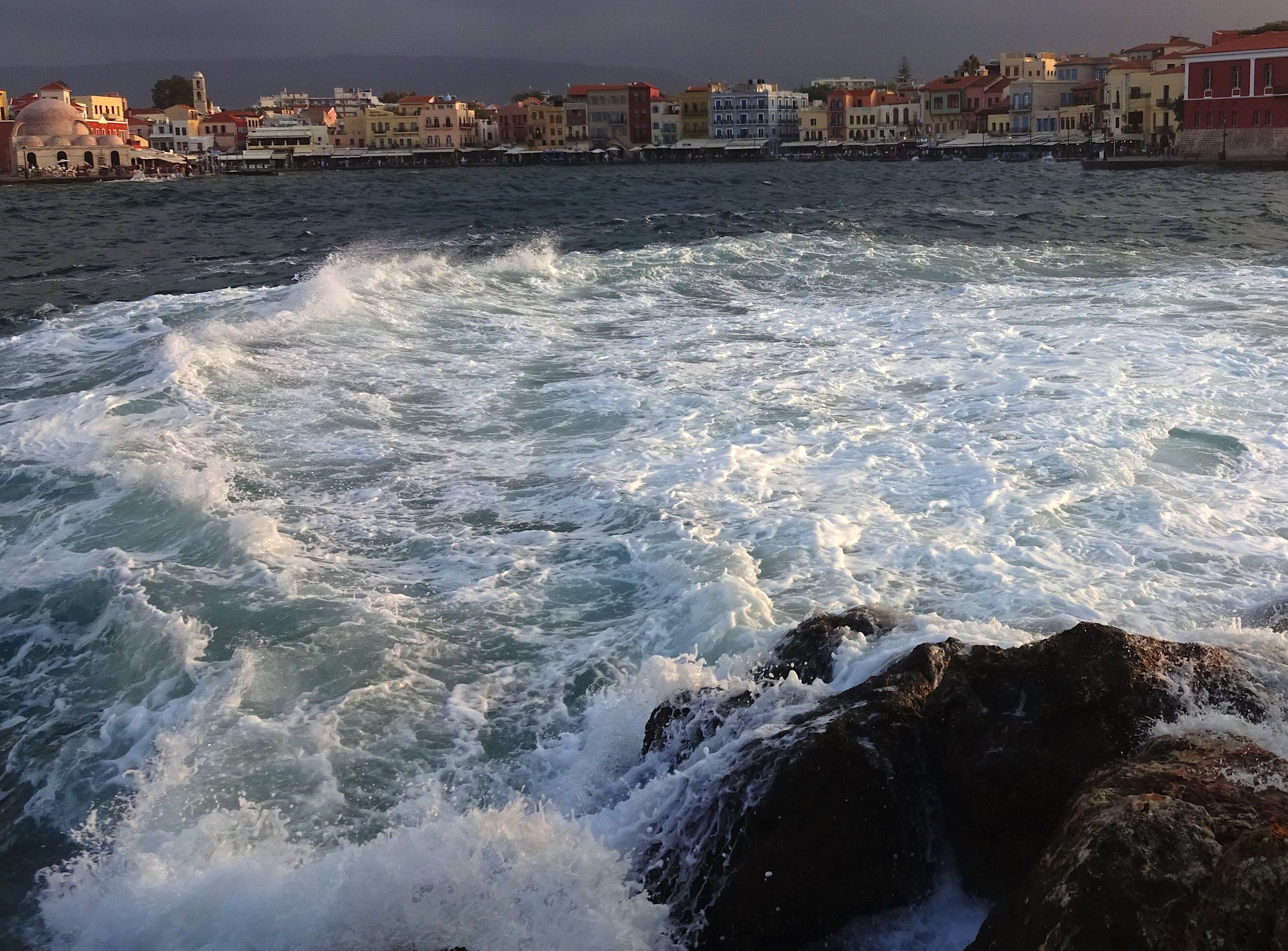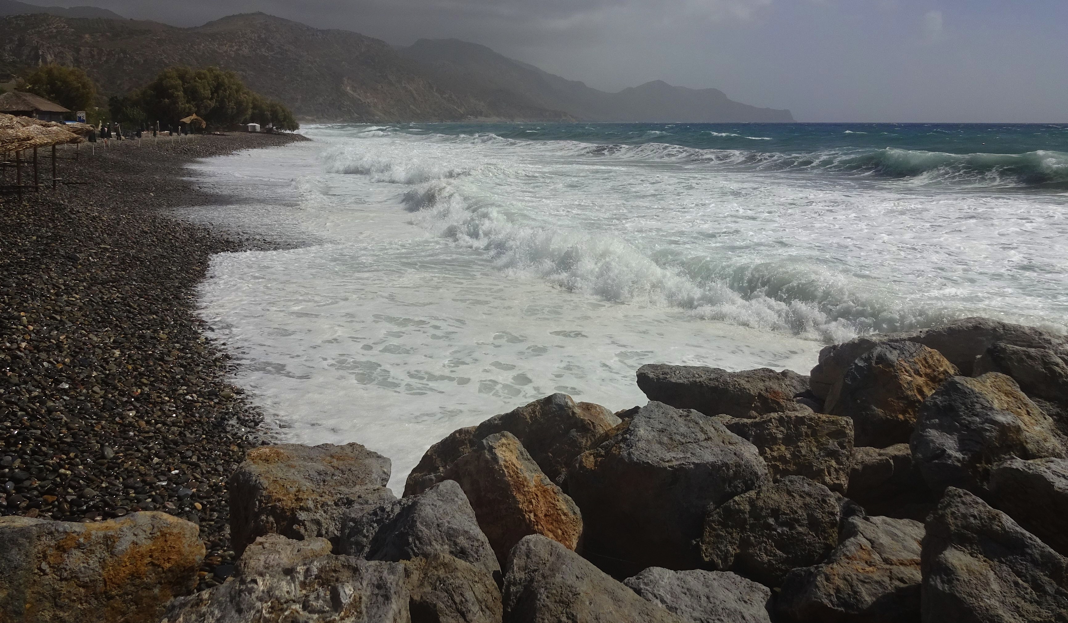 Seit gestern Nachmittag sind wir in Paleochora! Auch hier ist das Wetter gerade ziemlich unbeständig. Bei unserer Ankunft hat es geregnet, aber immerhin ist es hier im Südwesten wesentlich wärmer als im Norden und nicht mehr so windig. Weststrandstimmung heute in der Früh: Beim Oststrand und im Hafen waren heute wilde Wellen und schaurige Stimmungen:
