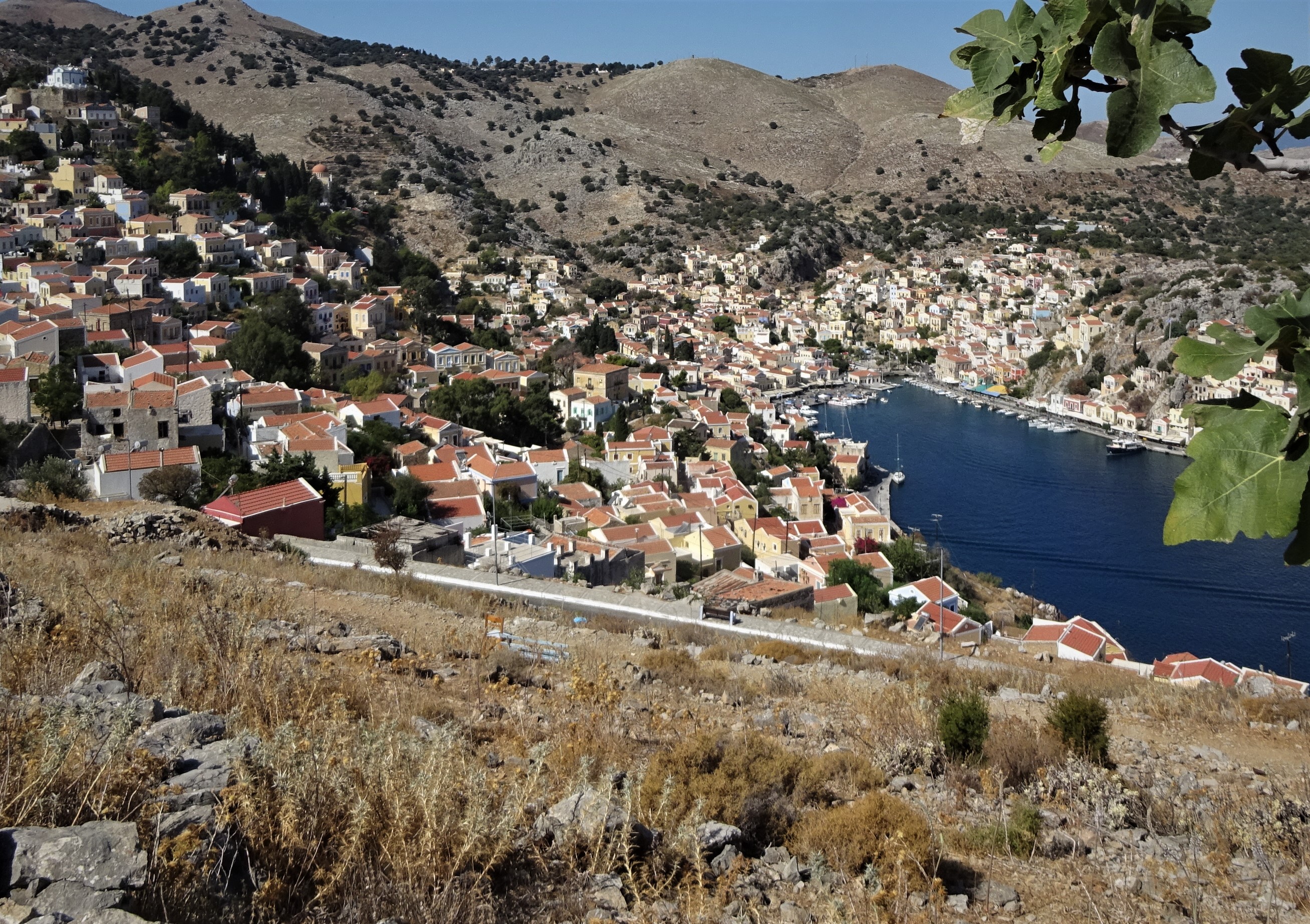 Den Hafenort von Symi hab ich im Auszeitjahr von einer Fähre aus schon mal gesehen. Der hübsche und vielbesuchte Ort wirkte durch die enge Hafeneinfahrt und die Hänge rundherum ziemlich eingekesselt und sah im Abendlicht irgendwie schaurig aus. So empfand ich es auch dieses Mal. Ich hab mich entschieden, die Insel jetzt zu besuchen, weil