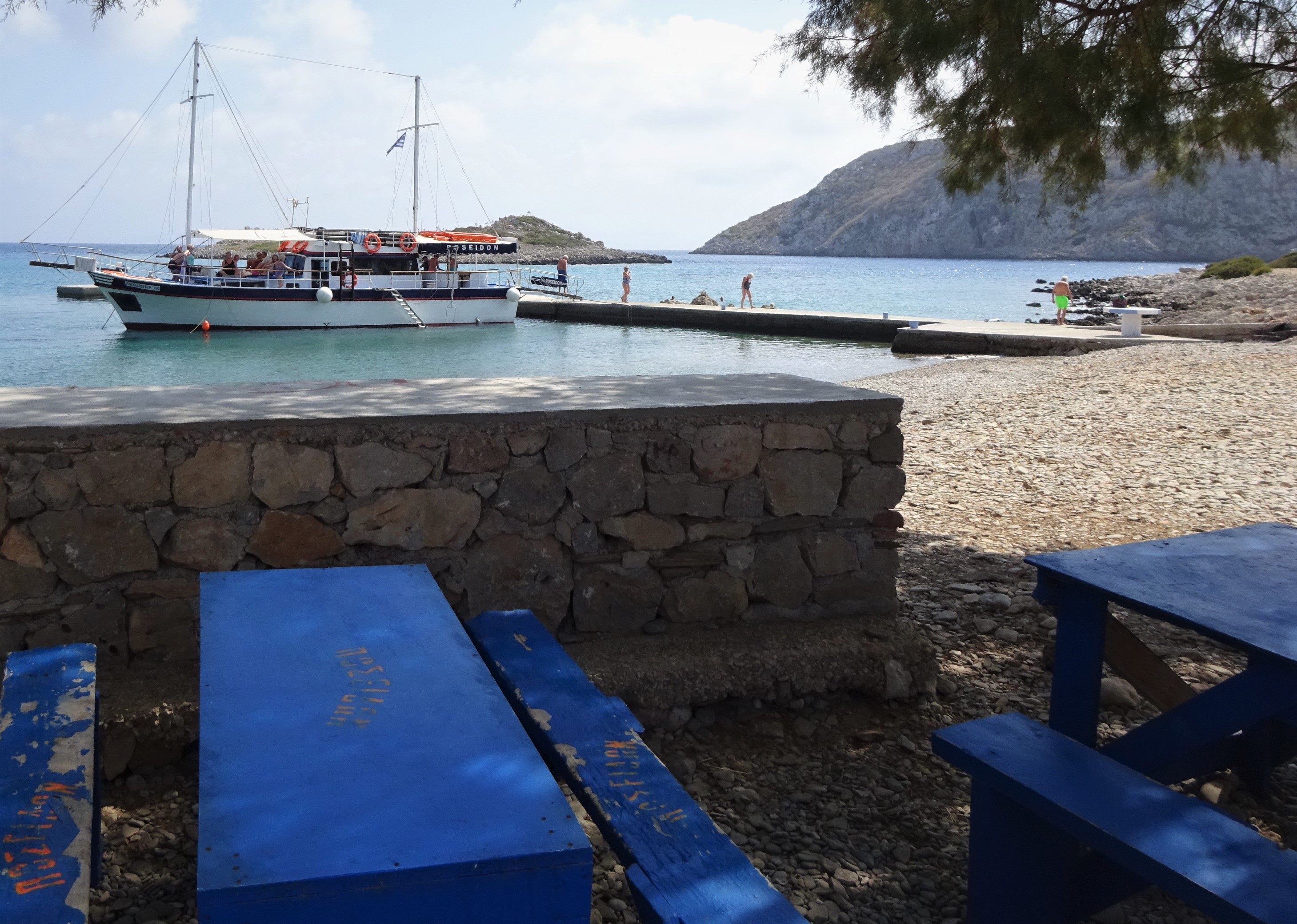 Den streikbedingten zusätzlichen Symi-Tag habe ich für einen ganztägigen Bootsausflug „Round the Island“ mit dem Ausflugsboot „Poseidon“ meines Zimmervermieters genutzt. Nach einer sehr windigen Nacht war das Wetter heute in der Früh noch recht wechselhaft. Sonne-Wolken-Regentropfen-Mix. Erste Bilder von der Bootsfahrt: In der kleinen Bucht von Emilianos mit gleichnamigem Mini-Kloster gabs den ersten Stopp: Hier