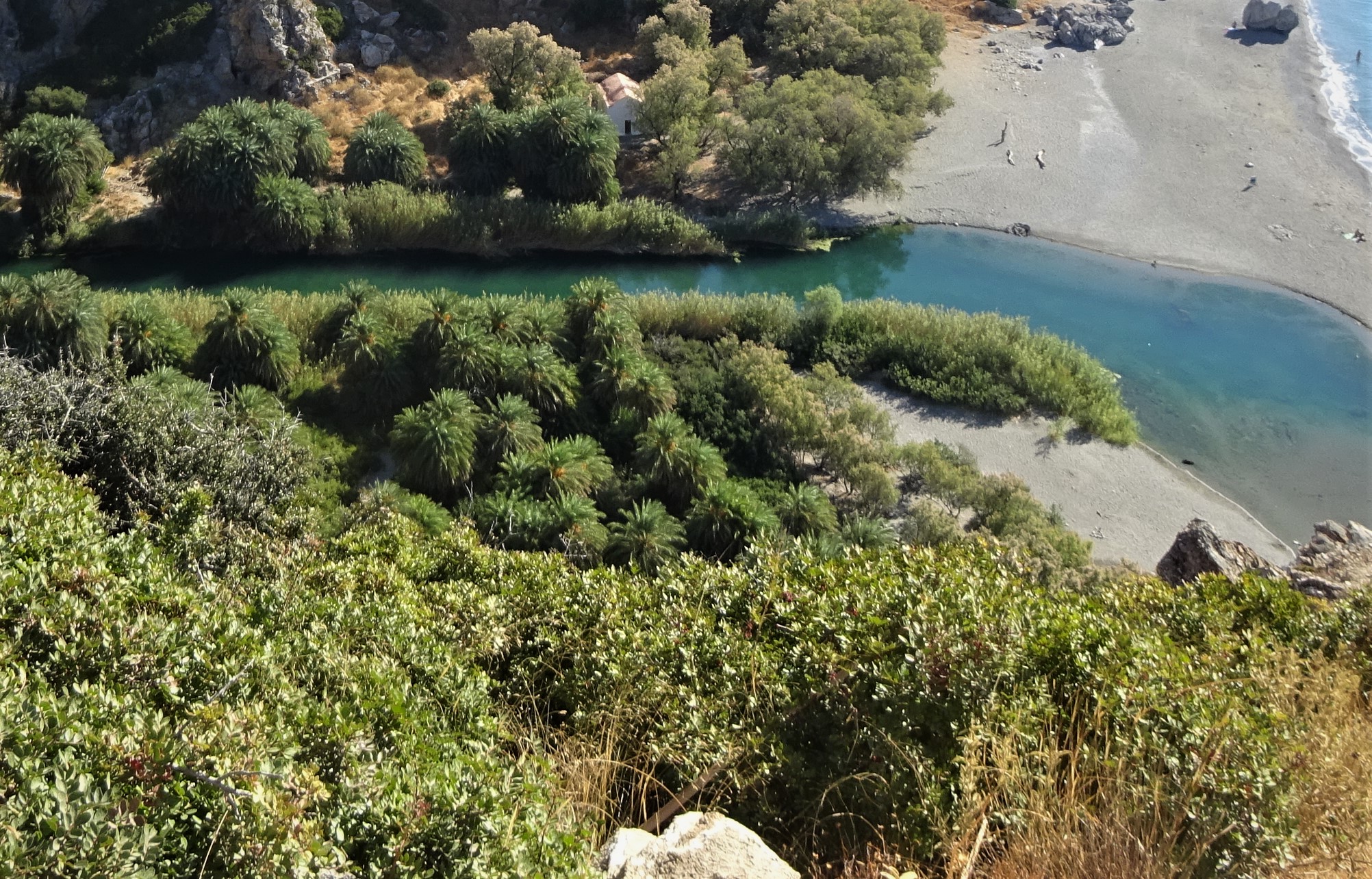 Heute habe ich wieder einmal Preveli besucht. Preveli war früher eine der Hippie-Hochburgen Kretas. Als ich 1991 mit dem damals 2-jährigen Raphael hier war, lebten immer noch etliche Leute in Bambushütten unter den Palmen entlang des grünen Flusses, der am schönen Strand ins Meer mündet. Bei meinem letzten Besuch vor ein paar Jahren mit Edo