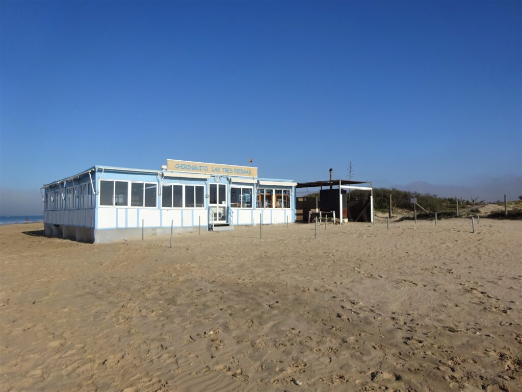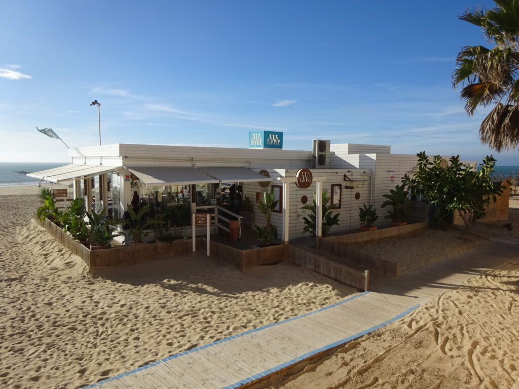 nur ein paar wenige haben noch Betrieb. Diese geöffnete Strandbar steht direkt am Stadtstrand von Chipiona: