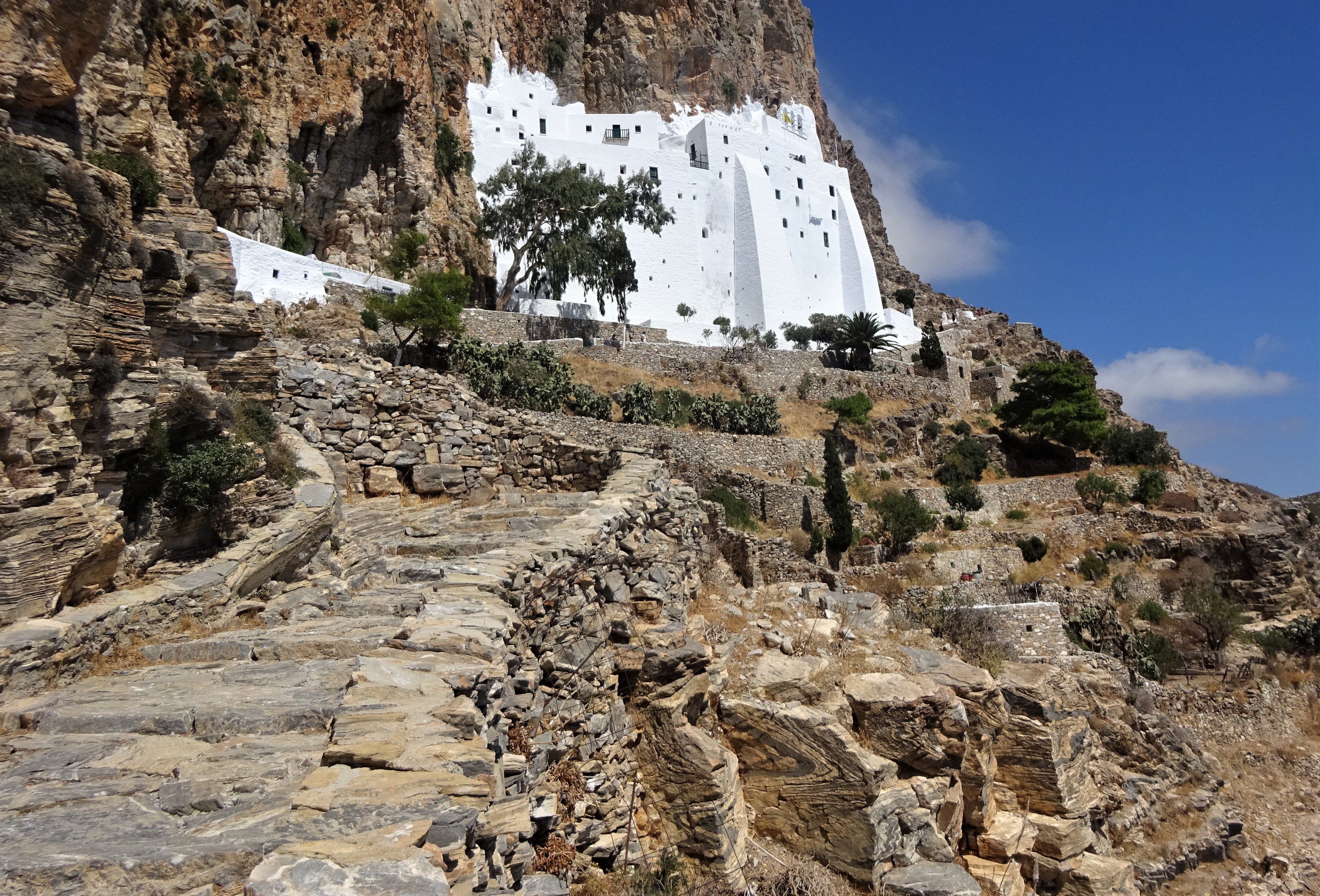 Morgendlicher Blick von meinem Zelt: Mein heutiger Tagesplan war, das Klosters Chozoviotissa und meinen früheren „Wohnstrand“ Agia Anna zu besuchen. 1985 war die wilde Gegend hinter Chora nur per aufwändigem Fußweg erreichbar, heute gibt es eine Straße samt Busverbindung. Ich bin mit dem Bus zur Klosterhaltestelle gefahren. Für den Besuch des Klosters war ich meiner