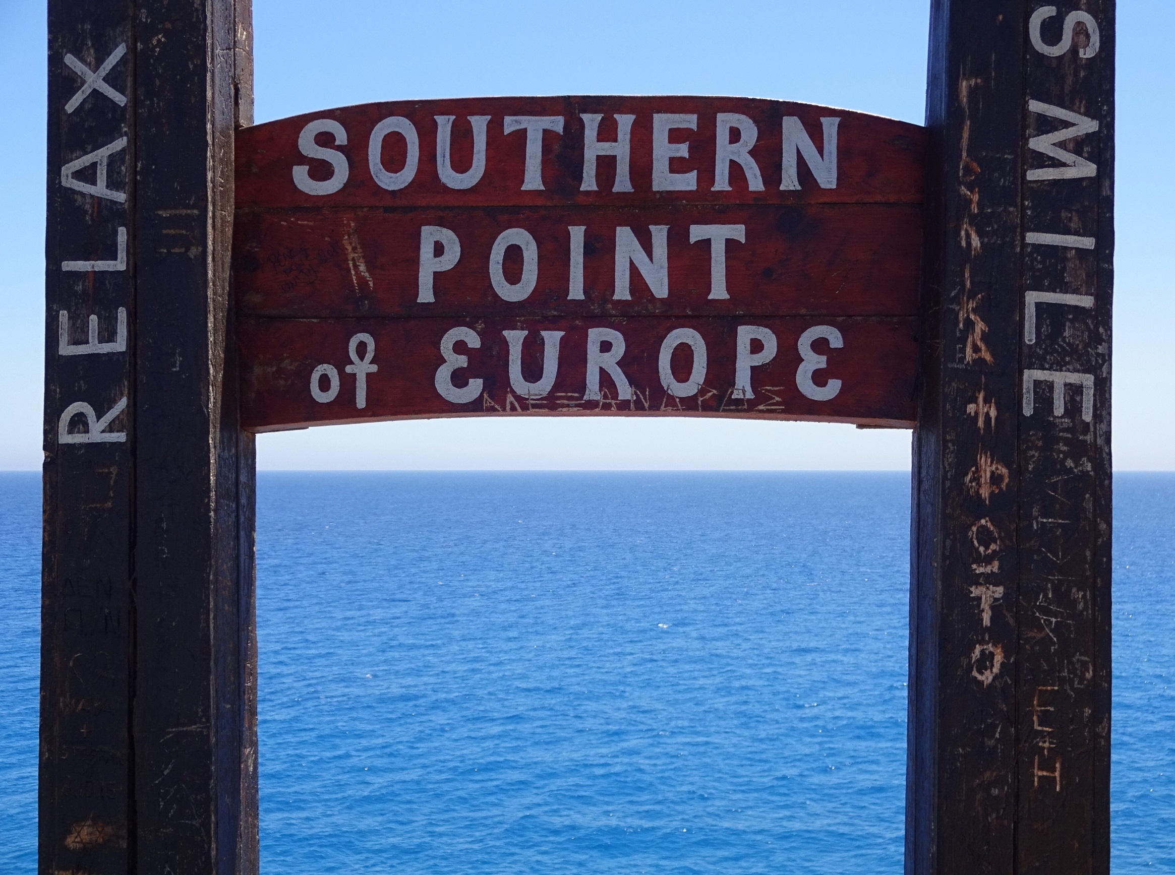 Ich sitze gerade in meiner Frühstückstaverne, trinke kretischen Bergkräutertee (die Loukoumades haben die Katzen gefressen, während ich zum Telefonat mit Kostas gerufen wurde) und sende meinen Tagesbericht von gestern: Heute bin ich zum südlichsten Punkt Europas gewandert. Die Kanaren sind ja geografisch afrikanisch und Zypern liegt geografisch in Asien. Das südliche Ende Europas ist angeblich