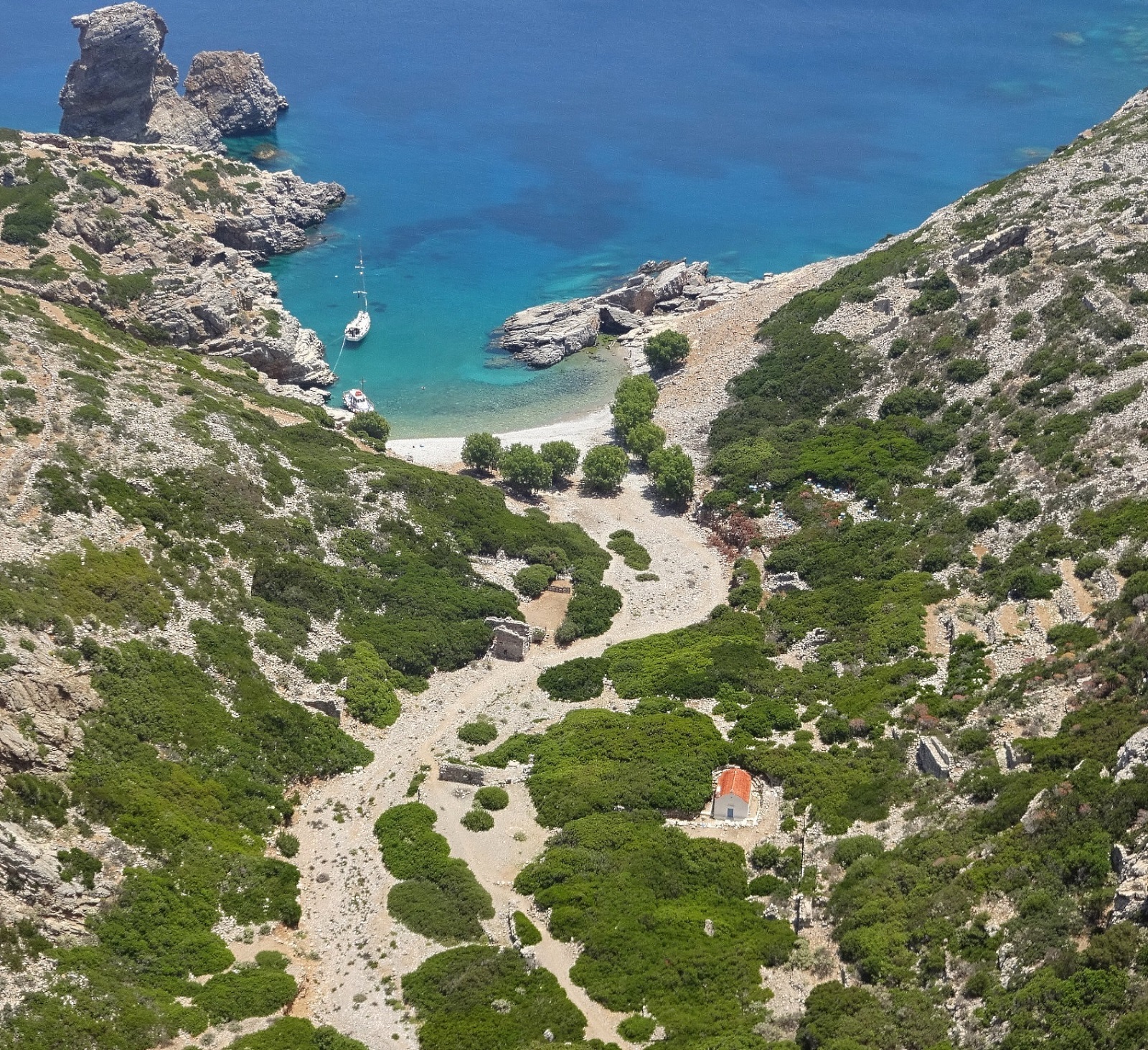 Heute war ich auf dem Inselchen Saría nördlich von Karpathos. Um 10 Uhr ging die Fahrt mit dem Kaíki von Nikos los. Außer mir waren noch 8 weitere Gäste an Bord. Wir machten Stopp in einer der Höhlen am Nordende von Karpathos und Nikos erzählte, dass hier die früheren Bewohner von Saría Schutz suchten, wenn