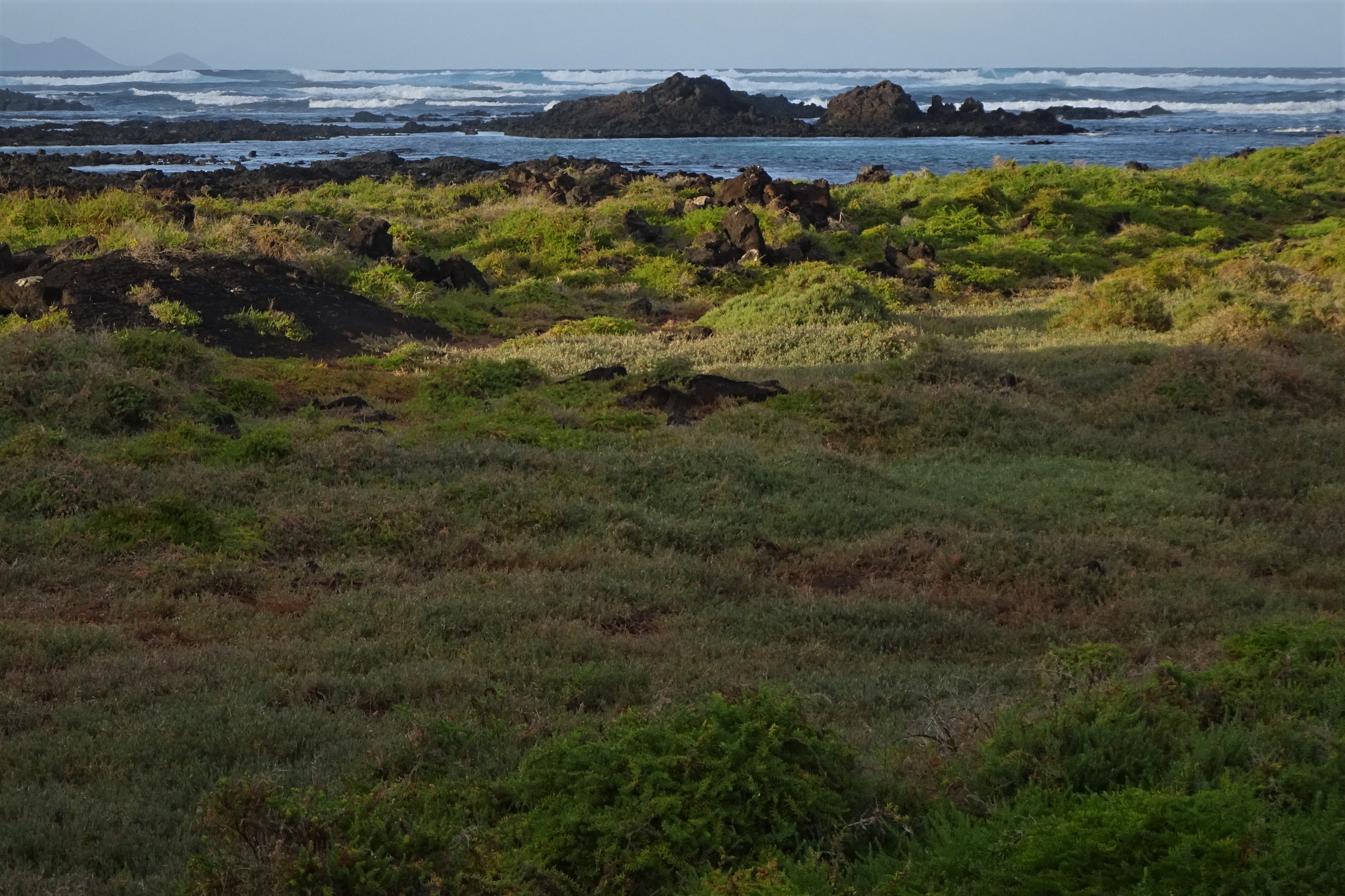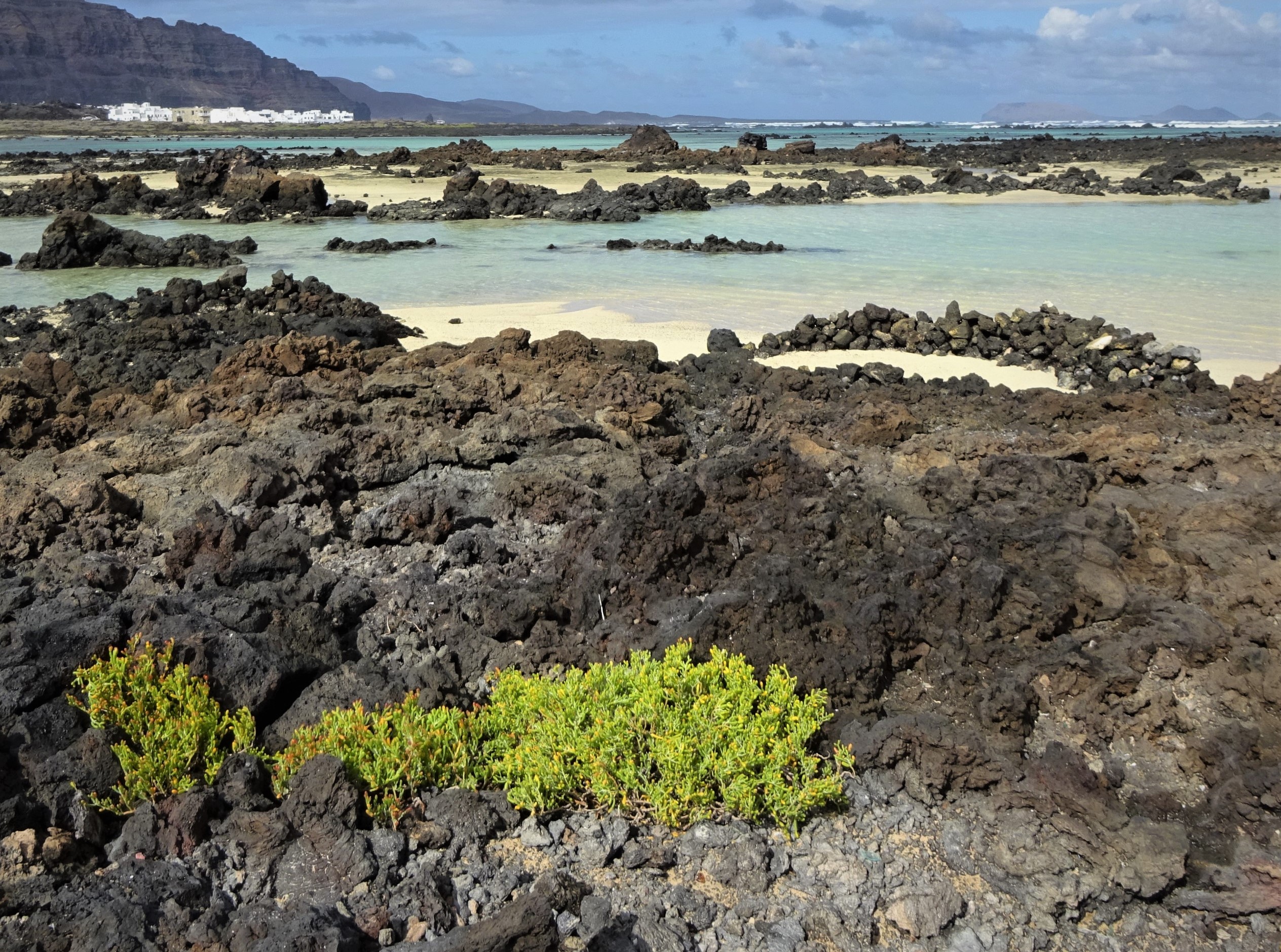 Eigentlich wollte ich heute doch den geplanten Ausflug nach Graciosa machen, aber heftige Regenschauer und böiger Nordwind hielten mich weiterhin davon ab. Am späteren Vormittag sah das Wetter dann wandertauglich aus und ich beschloss, an der Küste Richtung Cueva de los Verdes zu gehen. Gleich hinter Orzola beginnt das riesige Malpais. Blick zum Dorf: und