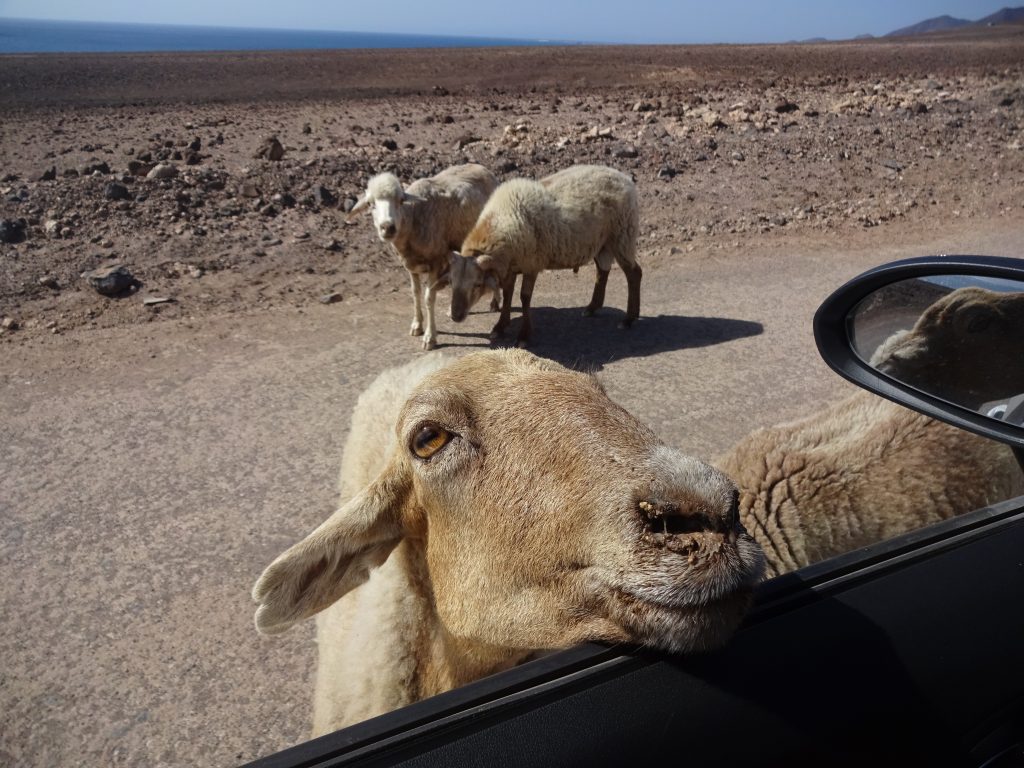 Anbei einige Bilder des Nachmittags. Das erste Foto zeigt die freche Schafbande, die zurzeit auf der Schotterstraße in den Süden in Robin Hood Manier Autos „überfällt“. Sie sind zu siebt und laufen, wenn ein Auto kommt, mitten auf die Straße. Wenn man so wie ich beide Fenster ganz offen hat, sind plötzlich links und rechts Schafköpfe im Auto. Der Rest der Bande umstellt den Wagen. Mein gesamter Brotvorrat ging drauf, um die Schafe vom Auto wegzulocken. Wobei sie sehr raffiniert vorgehen. Zu den Brotstücken laufen immer nur 2 Schafe, der Rest umstellt weiterhin das Auto, bis wirklich nichts mehr zu holen ist. Nachdem der „Wegzoll“ bezahlt war, durfte ich schließlich weiterfahren.