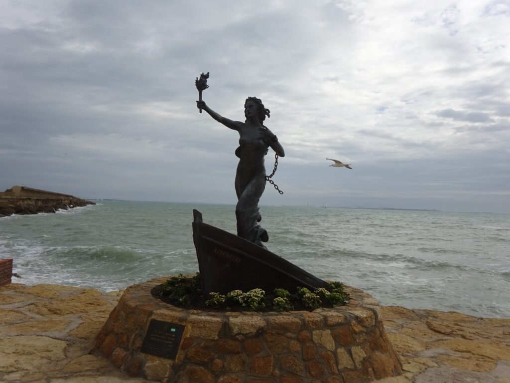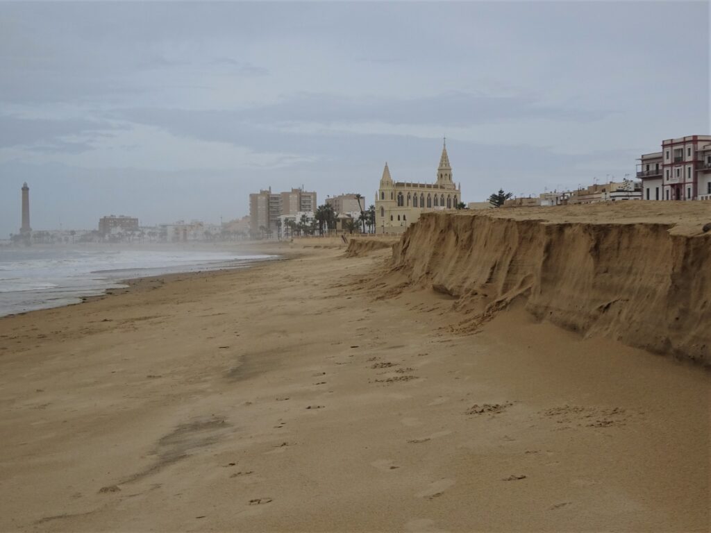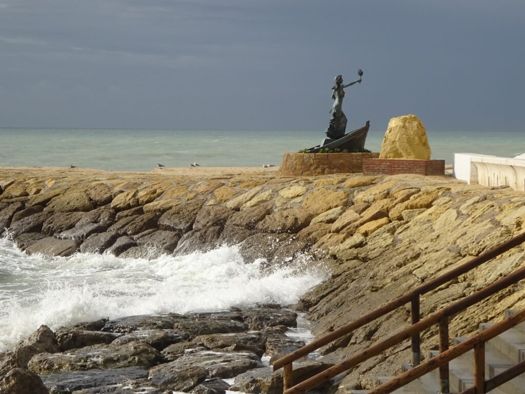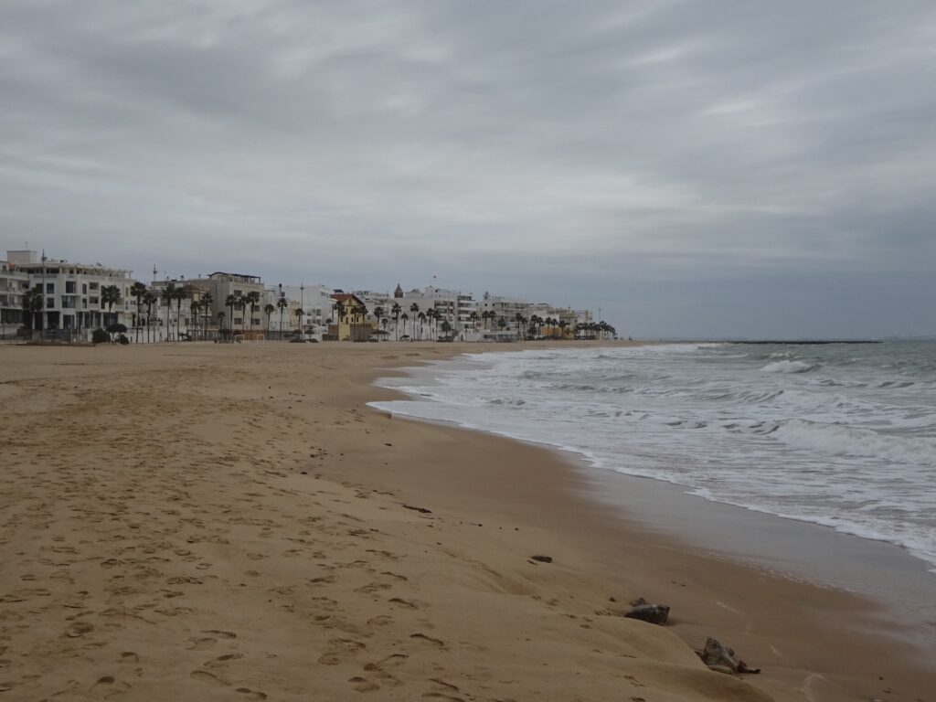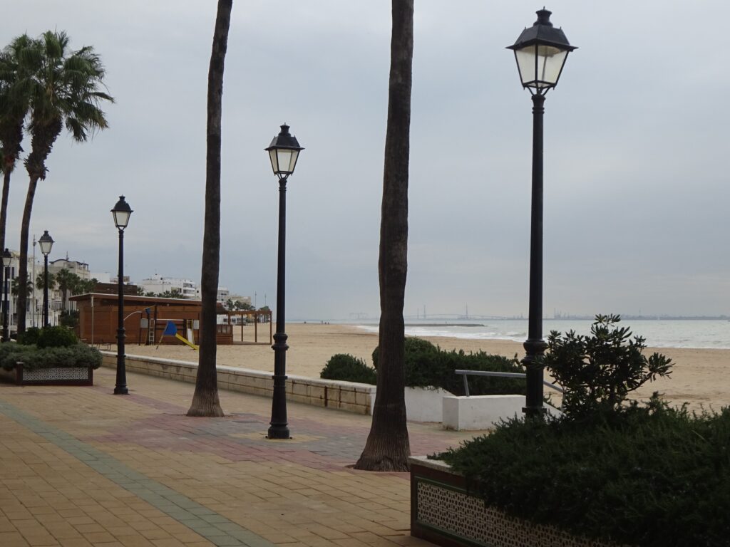 Das Wetter war aber heute nicht optimal zum Strandwandern, es war dicht bewölkt, kühl und regnerisch und ich hab beschlossen, mit dem Auto nach Rota zu fahren. Erster Blick auf Promenade und Stadtstrand, im Hintergrund ist Cadiz zu sehen:
