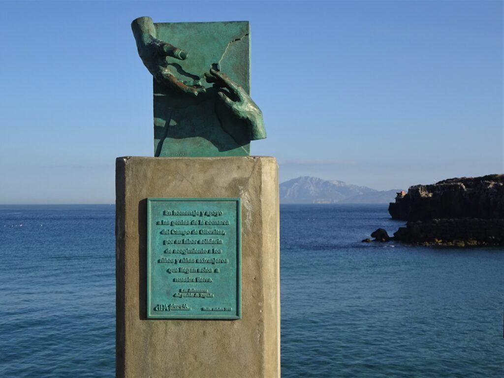 Zwei Hände, die eines Erwachsenen und die eines Kindes, getrennt durch 14 Zentimeter, die an die 14 Kilometer erinnern, die Tarifa von Marokko trennen. Die Skulptur soll auf die Rechte der unbegleiteten Minderjährigen hinweisen, die von Afrika in kleinen Booten hierher kommen und sie soll die Familien ehren, die sich um diese Kinder annehmen. Unter dem Motto „Sie sind Kinder, keine Migranten oder Ausländer“ wurde diese Skulptur samt Ehrentafel 2019 hier aufgestellt.