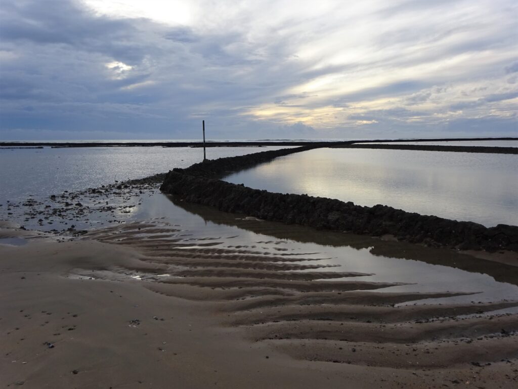 Bei Flut füllen sich die Becken mit Meerwasser samt Fischen, Krabben, Garnelen usw. Die Steinwälle sind dann von heraußen nicht mehr zu sehen.