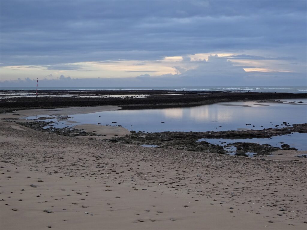 Die Pfähle, die hier an manchen Stellen im Meer zu sehen sind, markieren übrigens die „Corrales“, die aber nur bei Ebbe sichtbar sind. Dabei handelt es sich um große Steinwall-Pferche zum Fischfang nach einer uralten Tradition. Heute war erst abends Ebbe und da wars dann leider stark bewölkt, aber ich hab mal ein paar Corrales fotografiert: